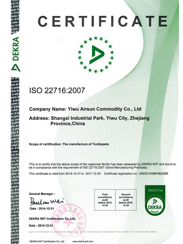 Сертификат ISO 22716 международный стандарт, рассмотренный и принятый в 2007 году. Был разработан специально для отрасли промышленности, относящейся к косметической продукции, и соответствует всем характерным особенностям данной отрасли.